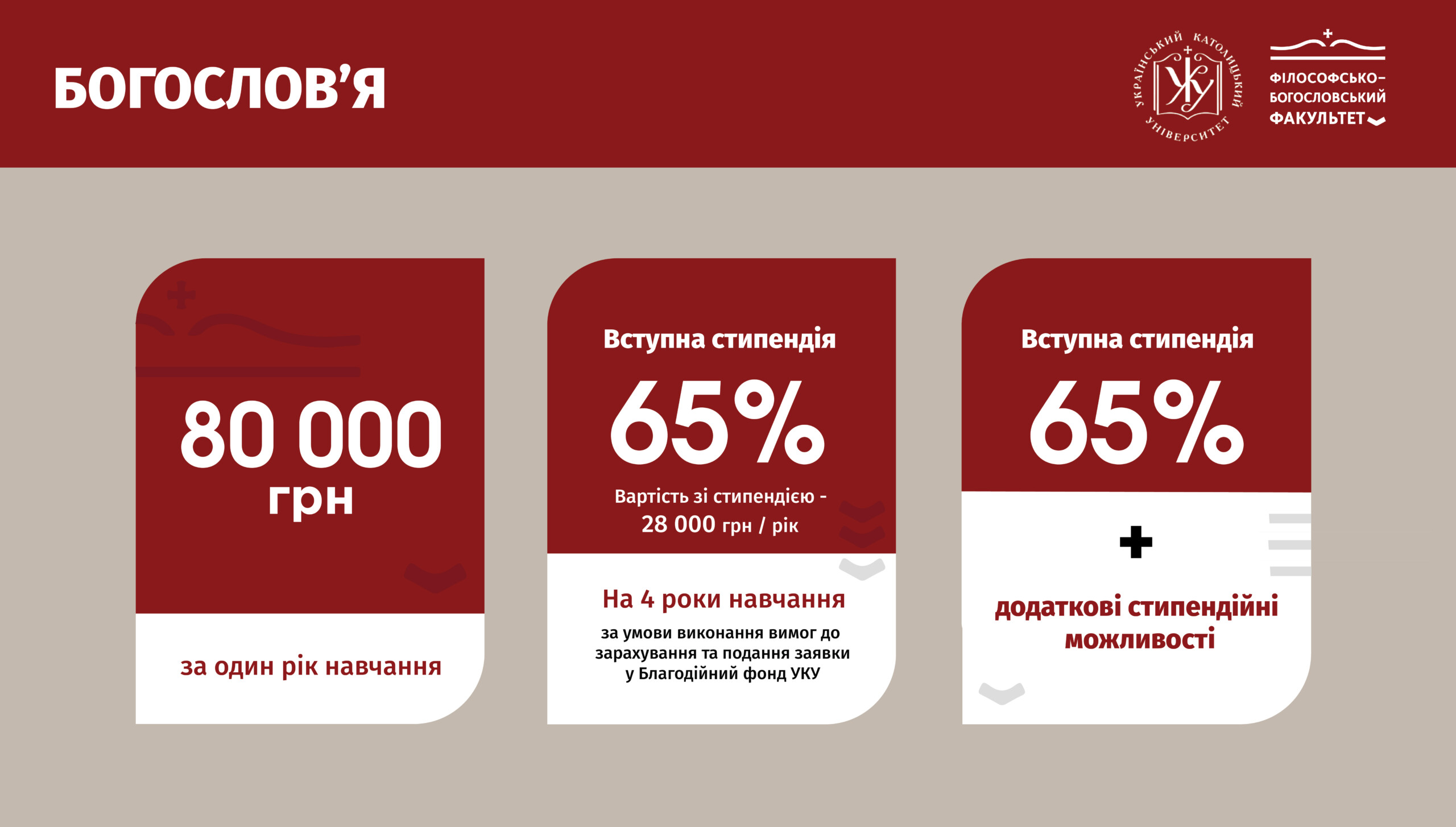 Вартість навчання на бакалаврській програмі з Богослов’я для вступників у 2022 році становить 80 000 грн за один рік. Благодійний фонд Українського католицького університету для вступників на програму “Богослов’я” у 2022 році надає вступну стипендію у розмірі 65% на 4 роки навчання на бакалавраті.